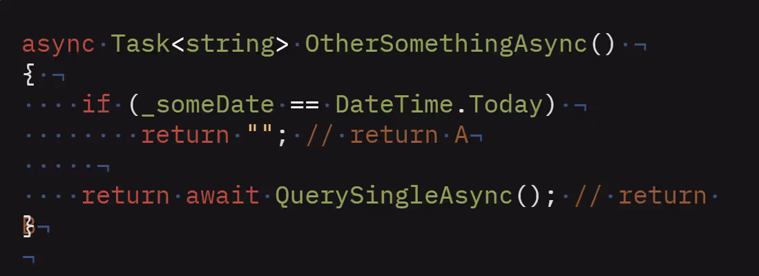 I dette tilfellet kan det hende du aldri vil se at du har et problem før det er for sent. Her kan man risikere to problemer, basert på hvilken av de to stedene metoden kan returnere. Først, er som nevnt over at man kan få deadlock, dersom man ender med return B og «QuerySingleAsync» ikke bruker «ConfigureAwait» som vist her. Det vil også gjelde dersom «QuerySingleAsync» hadde brukt «ConfigureAwait», men noe inne i denne metoden igjen ikke bruker «ConfigureAwait».