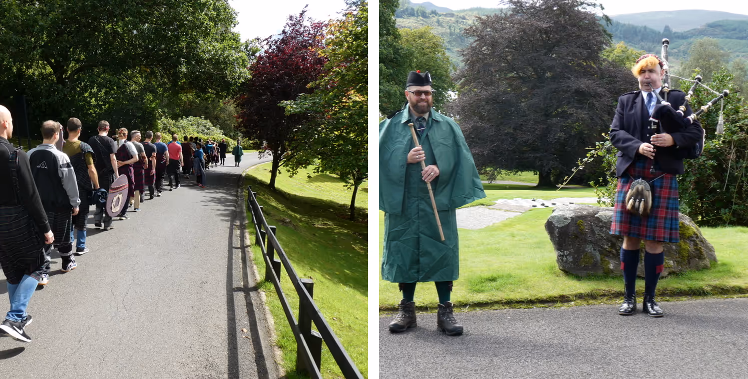 Vi marsjerte på rekke til slettene under kyndig sekkepipemarsj av to gale skotter; en gal general og en crazy sekkepipeblåser, som imponerte stort med sin kondisjon til både å fylle sekken og marsjere samtidig.