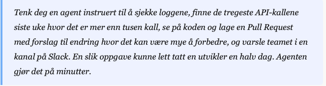 Jeg liker utfordringer og tar gjerne på meg oppgaver som ikke er bare koding. I dag kan moderne AI-agenter ta over mye av det mekaniske og repeterbare arbeidet. Analyse, koding, dokumentasjon, mønstergjenkjenning og forslag til forbedringer skjer på sekunder.