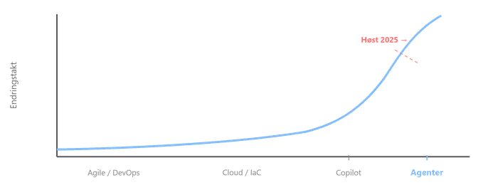 Fra høsten 2025 kom agentene for fullt: AI-verktøy som ikke bare foreslår kode, men som planlegger, skriver, tester og refaktorerer - på tvers av filer og kontekster. Produktivitetsøkningen er ikke lineær lenger, men eksponensiell. Hvor er vi nå?