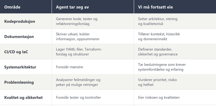 Tidlig i 2024 begynte teamet mitt og jeg å teste GitHub Copilot. Forsiktig, i «ask mode». Det virket ikke sannsynlig at GitHub Copilot kunne bidra så mye, vi har da tross alt mange års erfaring med å skrive god kode selv. Men ganske raskt så vi at den dekket alt vi pleide å hente fra dokumentasjonen, Google og Stack Overflow. Selv om vi så den kunne bidra med feil og forvirringer i tidlige versjoner, har den blitt mye bedre bare i første del av 2026. Uten at man har tenkt mye på det, brukes AI-verktøy mer og mer, som en naturlig del, både til problemløsing, forvaltning og videreutvikling.